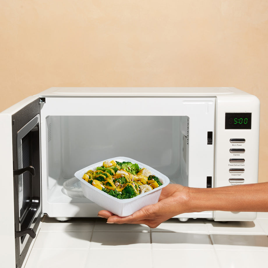 - 1 For microwave (1100W): Remove tray from carton and discard seal. Cook in this tray or transfer to any microwave safe bowl of your choice. Heat on high for 3 minutes. Stir. Heat for an additional 1-2 minutes.